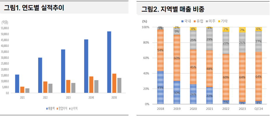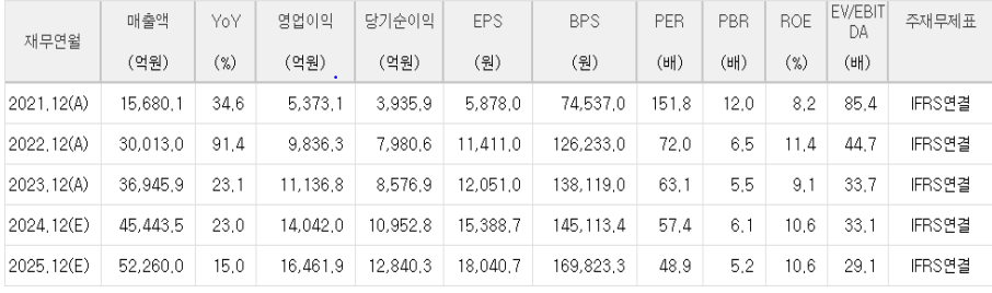 2021년에서 2022년 사이 매출액은 약 15,680.1억 원에서 30,013.0억 원으로 91.4% 증가했습니다. 2023년에도 23.1% 증가하여 36,945.9억 원에 달했으며, 2024년과 2025년에도 각각 23.0%와 15.0% 성장이 예상됩니다.