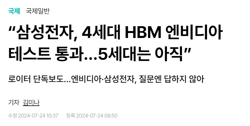 "삼성전자가 미국 반도체업체 엔비디아에 4세대 고대역폭메모리(HBM)인 HBM3을 납품하기 위한 품질 검증을 통과했지만, 5세대 고대역폭메모리인 HBM3E는 아직 기준을 충족하지 못해 해당 칩에 대한 테스트가 계속되고 있다고 로이터 통신이 24일(현지시각) 단독 보도했다.